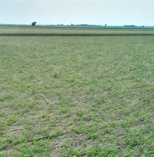 Soja - slika 3 desno, sejana v povaljano rž (in nekaj grašice, ki sedaj izbija kot plevel). Brez dodatnega mehanskega ali kemijskega varstva pred pleveli.